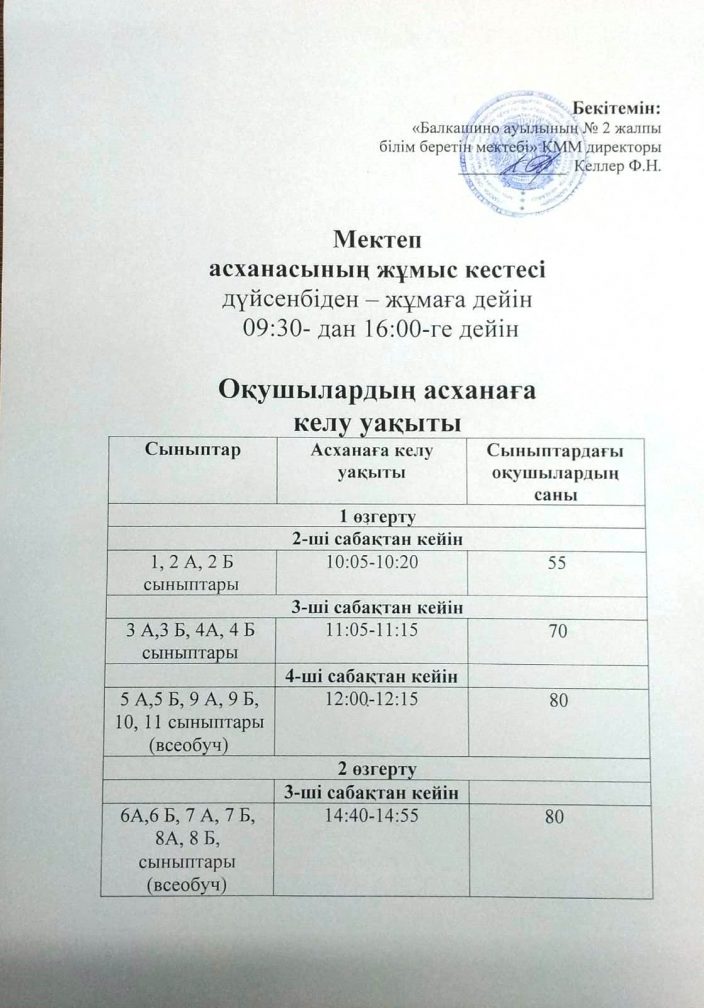 Мектеп асханасының жұмыс кестесі